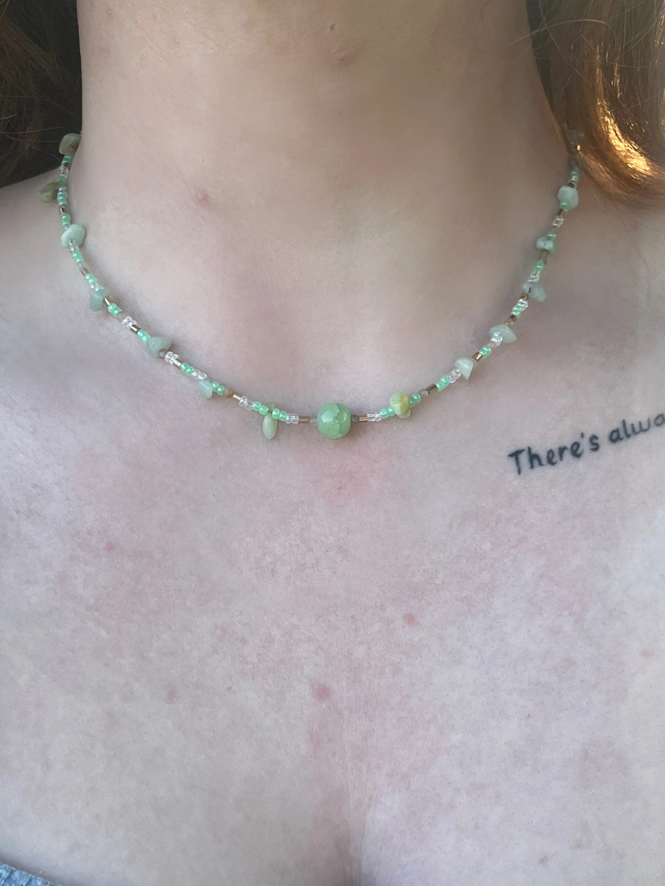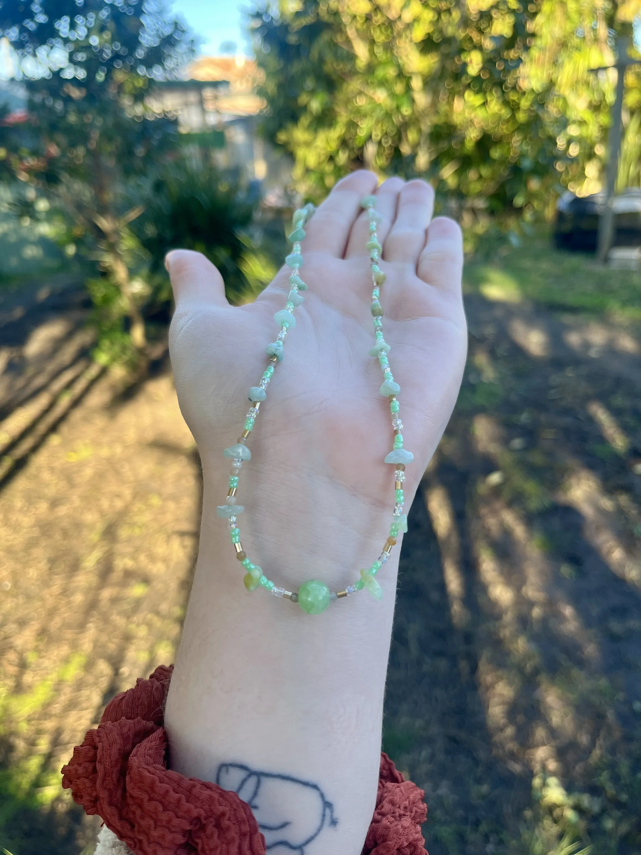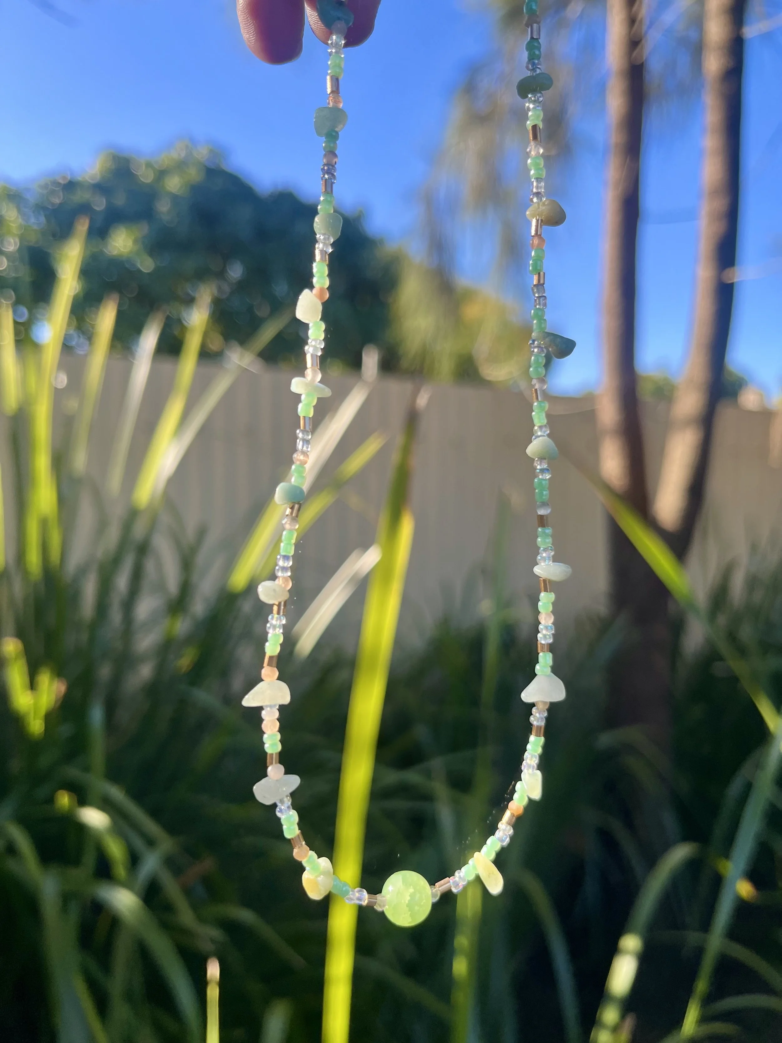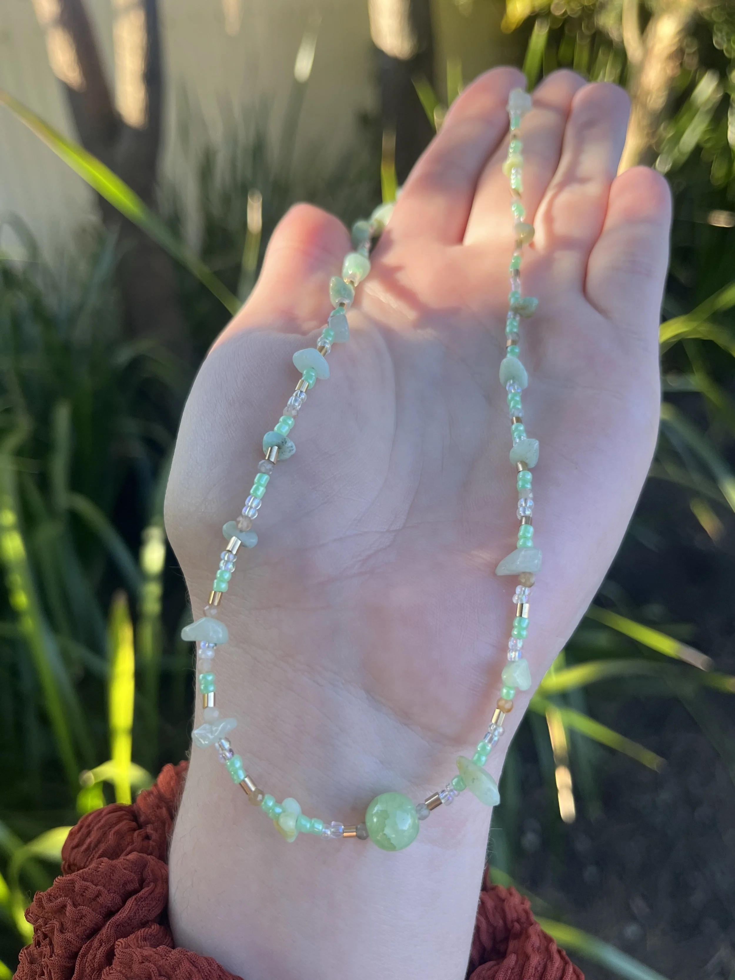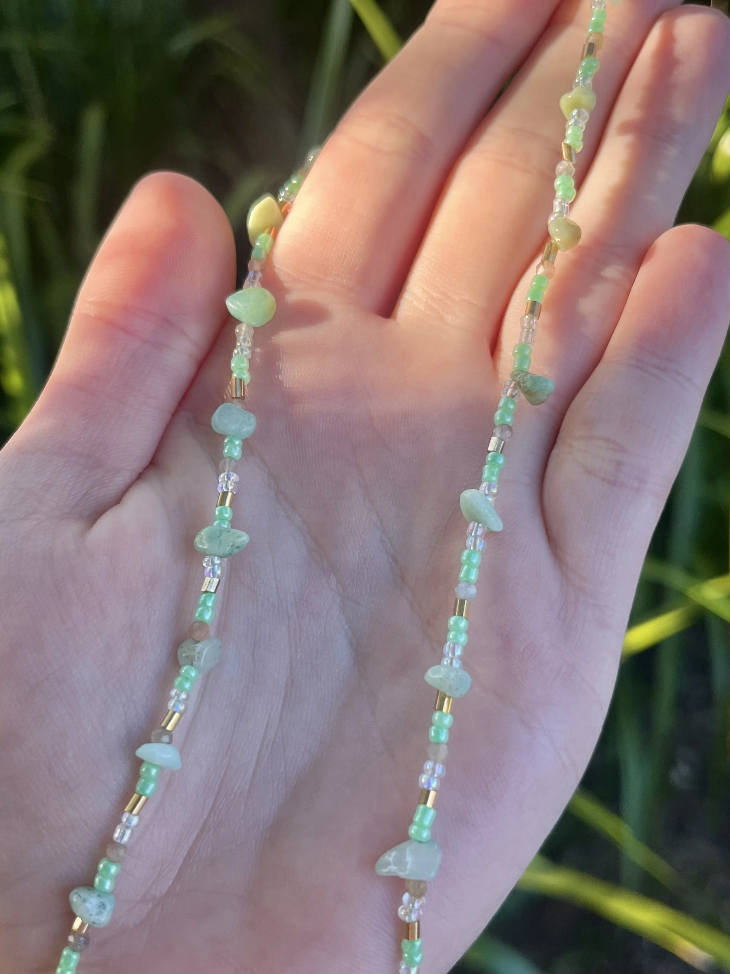 Made with Glass gold beads, Green and clear glass seed beads, aquamarine and jade stones, crystal beads, green glass bead and a gold plated over stainless steel clasp.